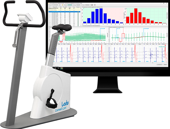 Программное обеспечение предназначено для предоставления врачу в режиме реального времени визуализированной ЭКГ, информации о текущей частоте сердечных сокращений, появляющихся аритмиях, параметрах ST-T усредненных нормальных комплексов QRST, ишемических изменениях, текущих параметров пробы и др.